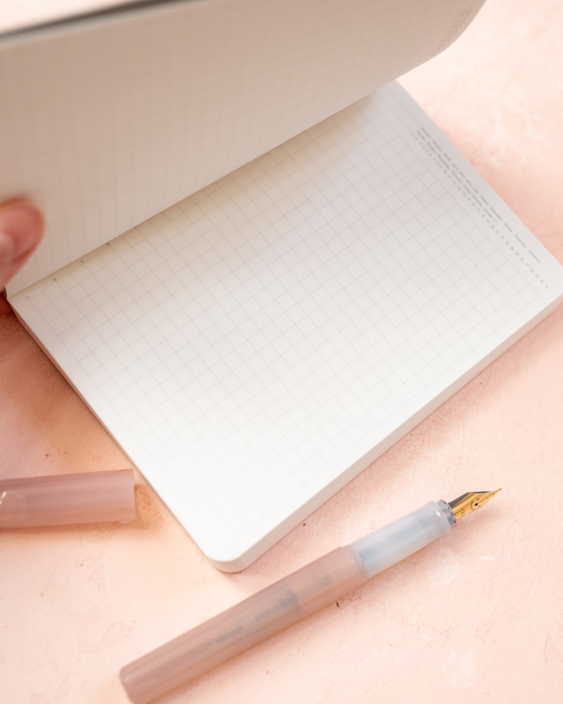 Inside, the pages feature a fine, 5mm light grey grid, discreet and pleasing to the eye. Each page is subtly structured with: