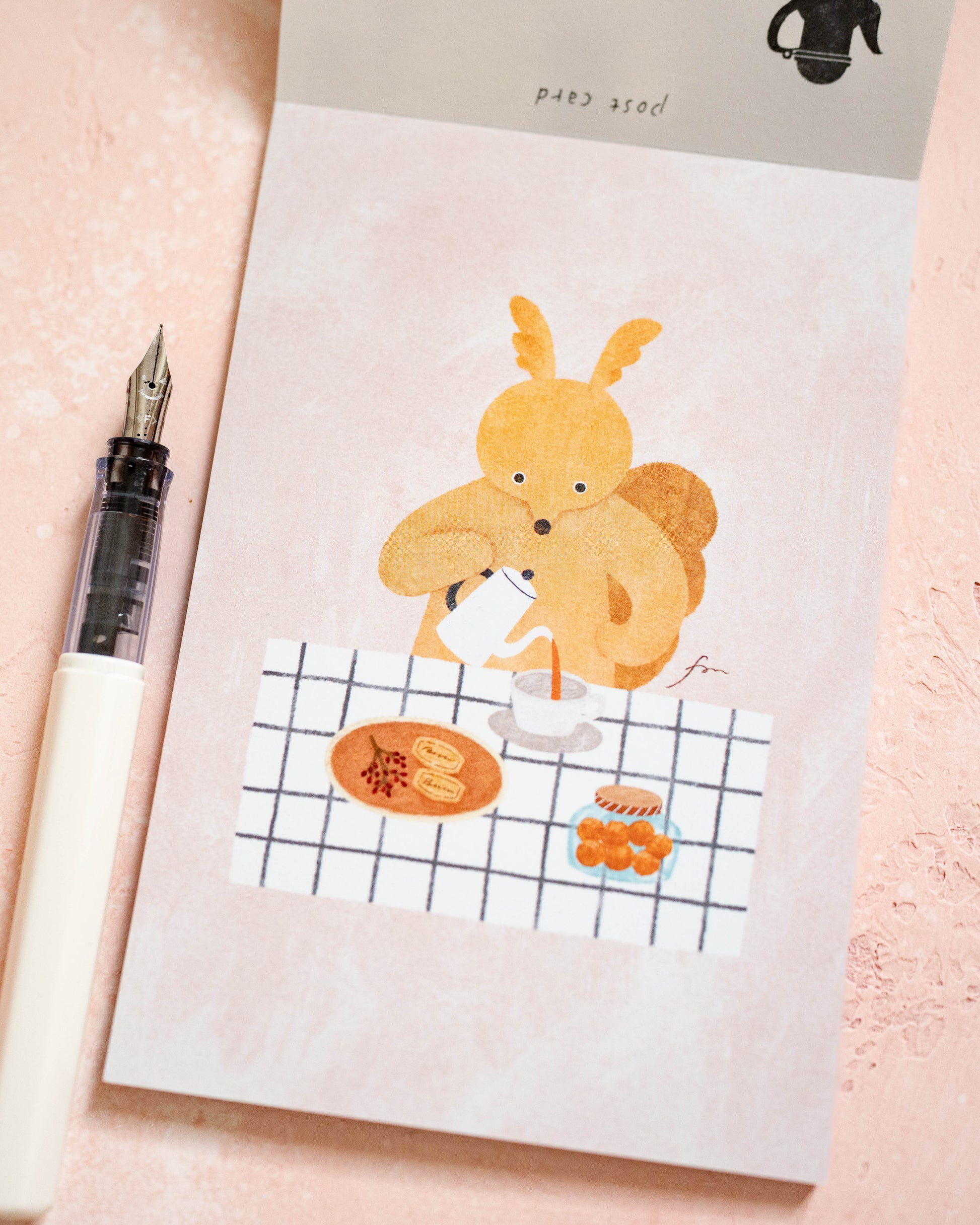 A beautiful postcard book illustrated by Mariko Fukuoka, featuring charming forest friends enjoying their tea time. Each card captures whimsical scenes full of adorable details, perfect for sending a sweet note or decorating your walls.