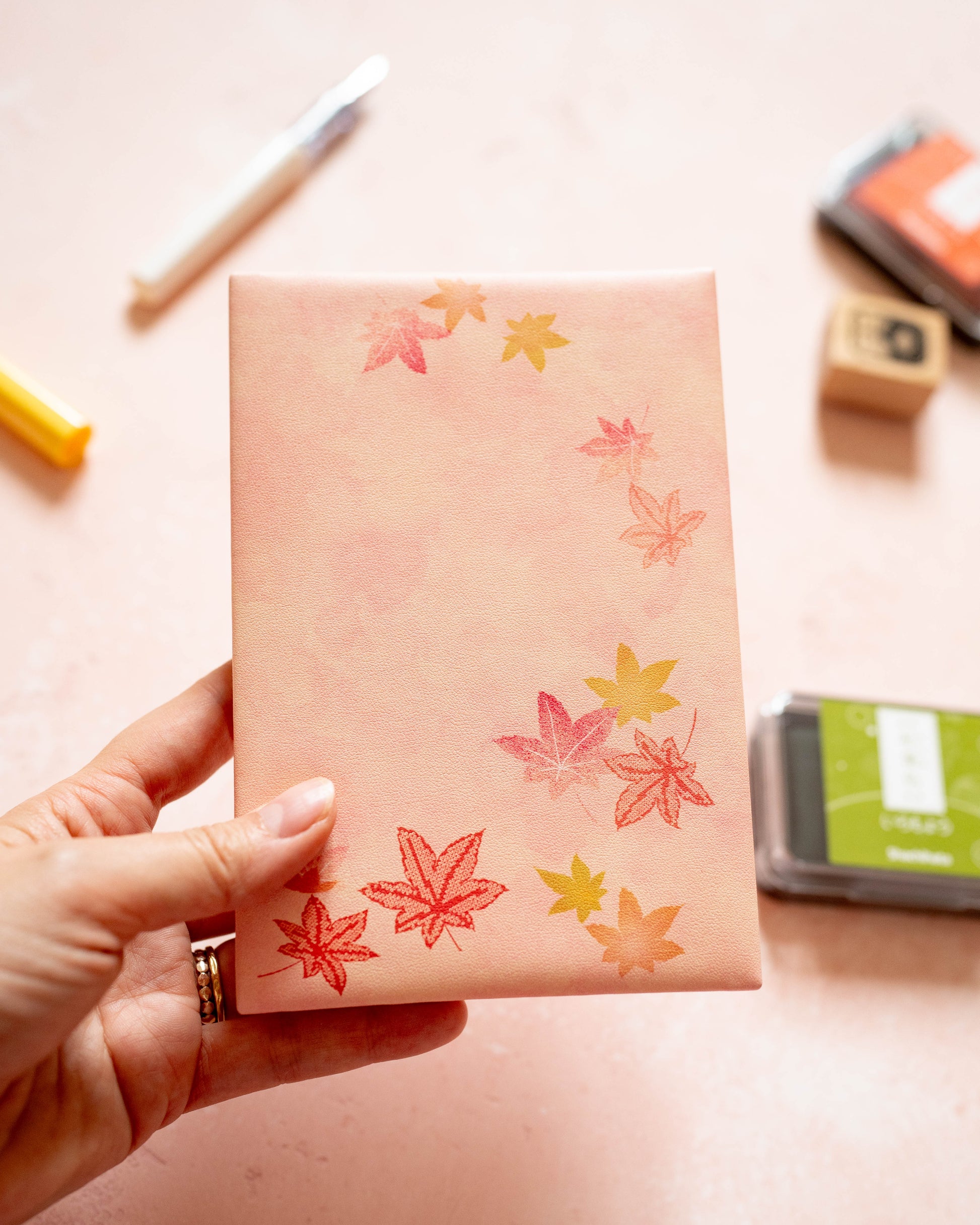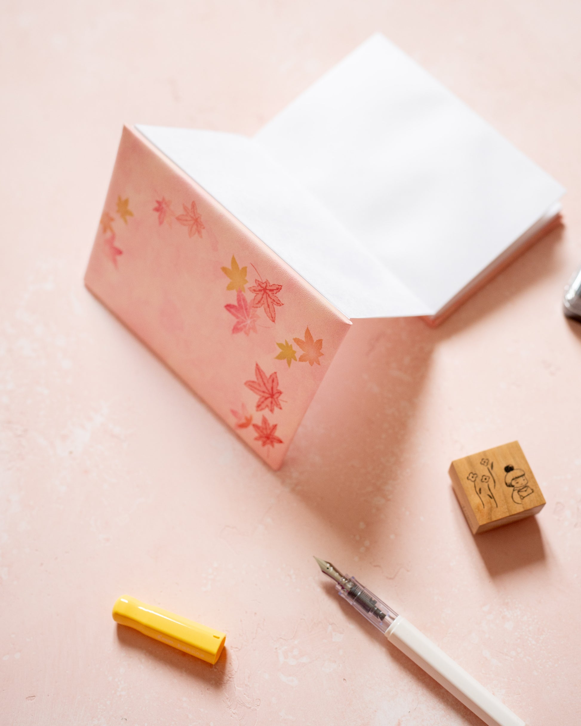 The soft faux leather cover is beautifully illustrated with dancing autumn maple leaves, creating a soothing, seasonal atmosphere. With its accordion-folded hosho paper, it adapts to your every need. The slightly absorbent paper enhances both ink and watercolor.
