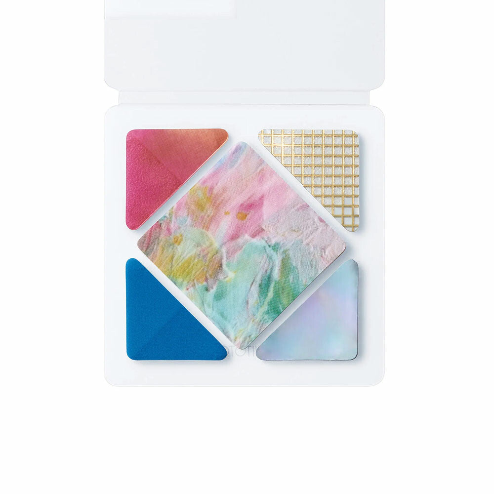 Each palette contains 4 to 6 sticker blocks with varied geometric shapes and refined effects: matte, gold, solid colors, grid patterns, brushstrokes, and marbled textures. Made of thin, semi-transparent PET film, these stickers are perfect for creating stunning layered effects.