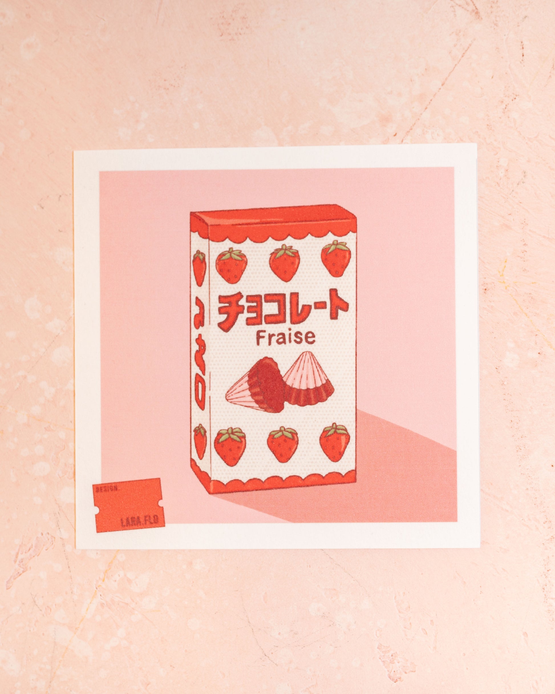 Inspired by her trip to Japan, Belgian illustrator LaraFlo Design created this print featuring the iconic packaging of the famous strawberry chocolates against a pop pink background. A playful and colorful way to celebrate Japanese food culture.