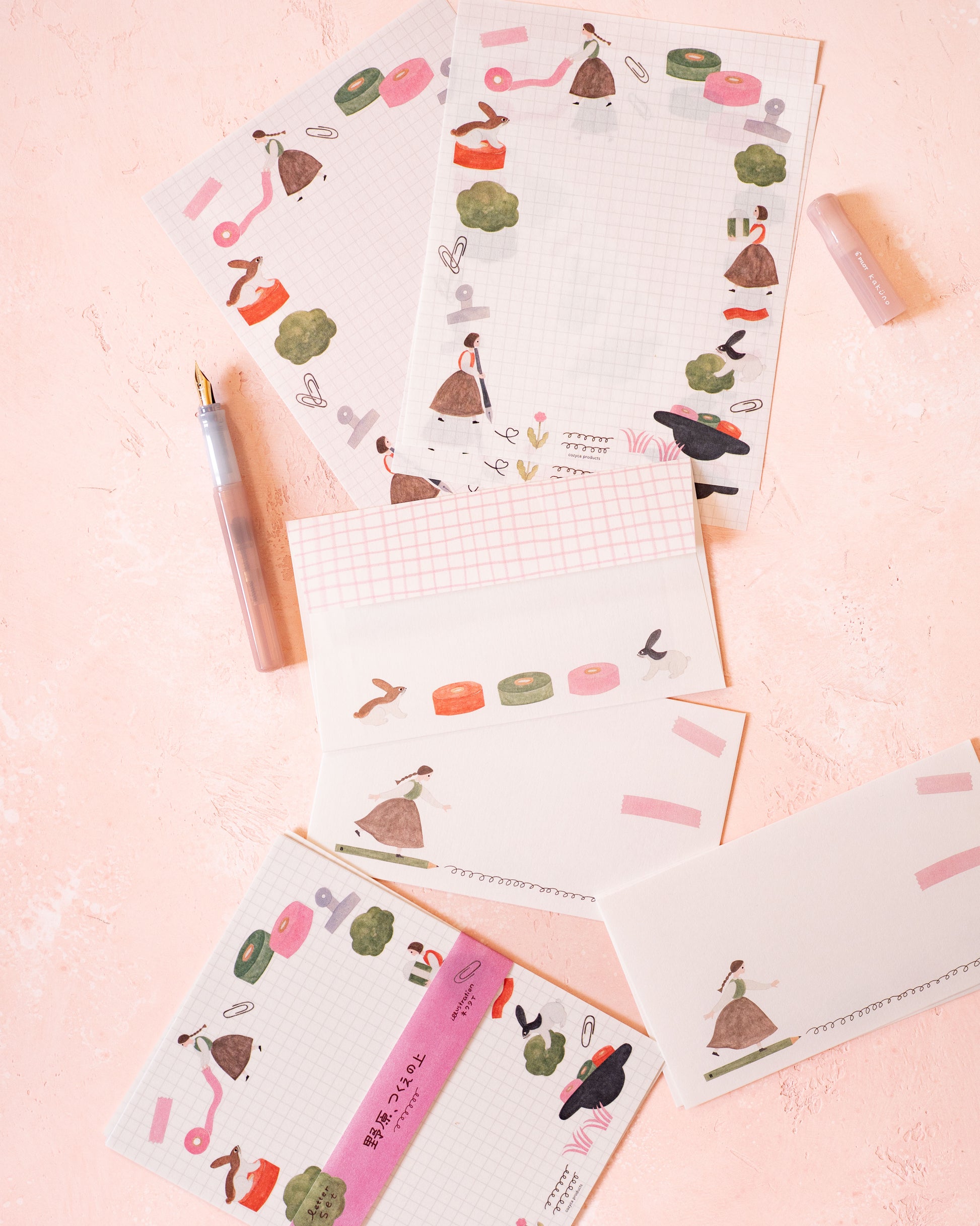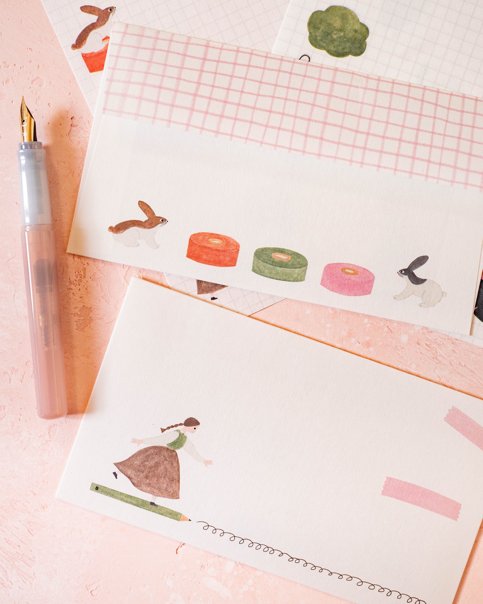 This Cozyca x Necktie letter writing set adds a touch of charm and whimsy to your handwritten letters. Illustrated by the artist duo Necktie, it transforms a simple desk cluttered with masking tape, paper clips, and pencils into a scene full of creativity and poetry. Each illustration, imbued with humor and sweetness, tells a little story of its own.