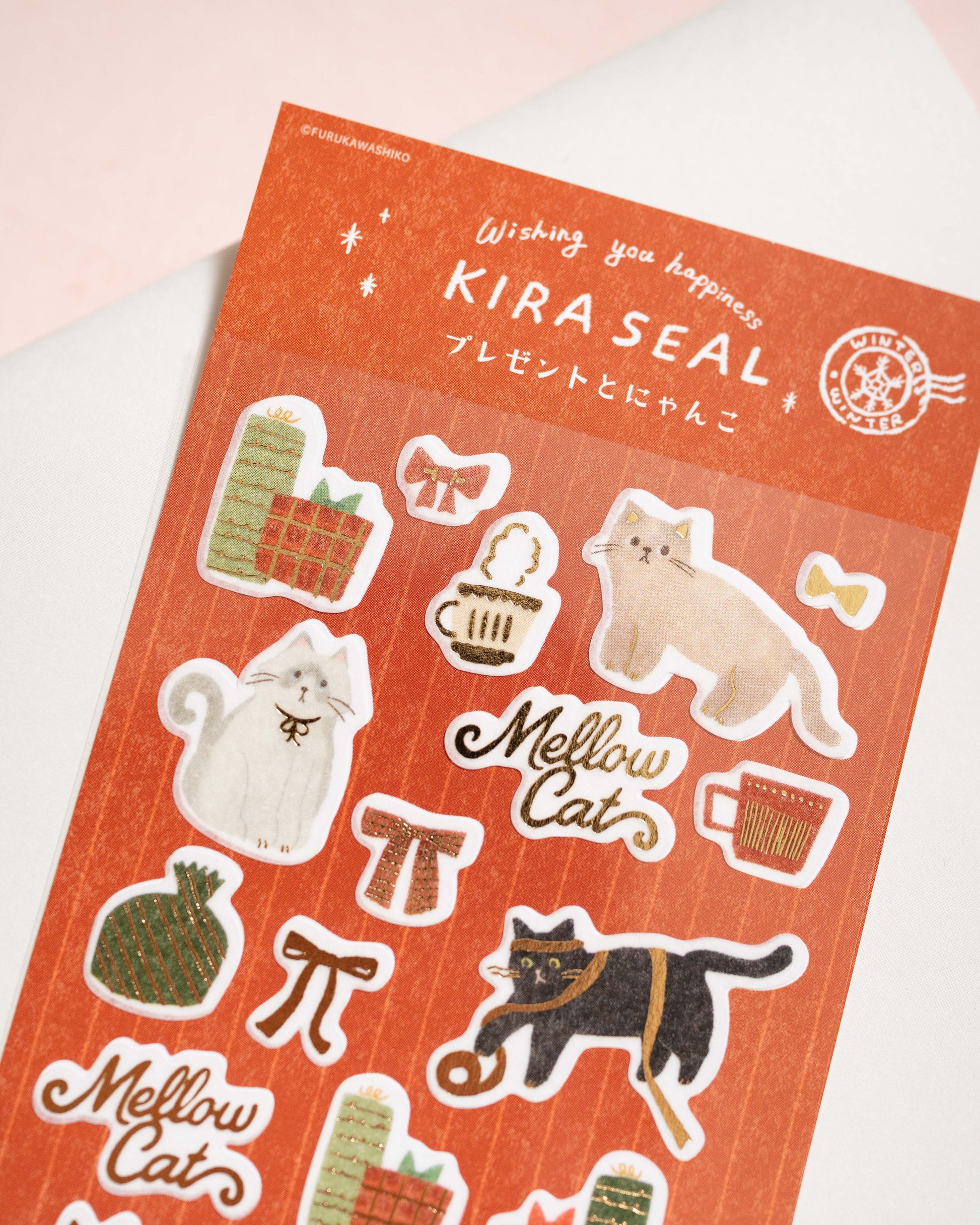 This sticker sheet is part of Furukawa Shiko Wa-Life's limited-edition Winter 2025 collection. It features a charming cat and gift theme in shades of red and green, complete with mugs and bows, creating a warm and festive atmosphere for winter and Christmas. Each sticker is enhanced with gold accents, adding a delicate and elegant touch.