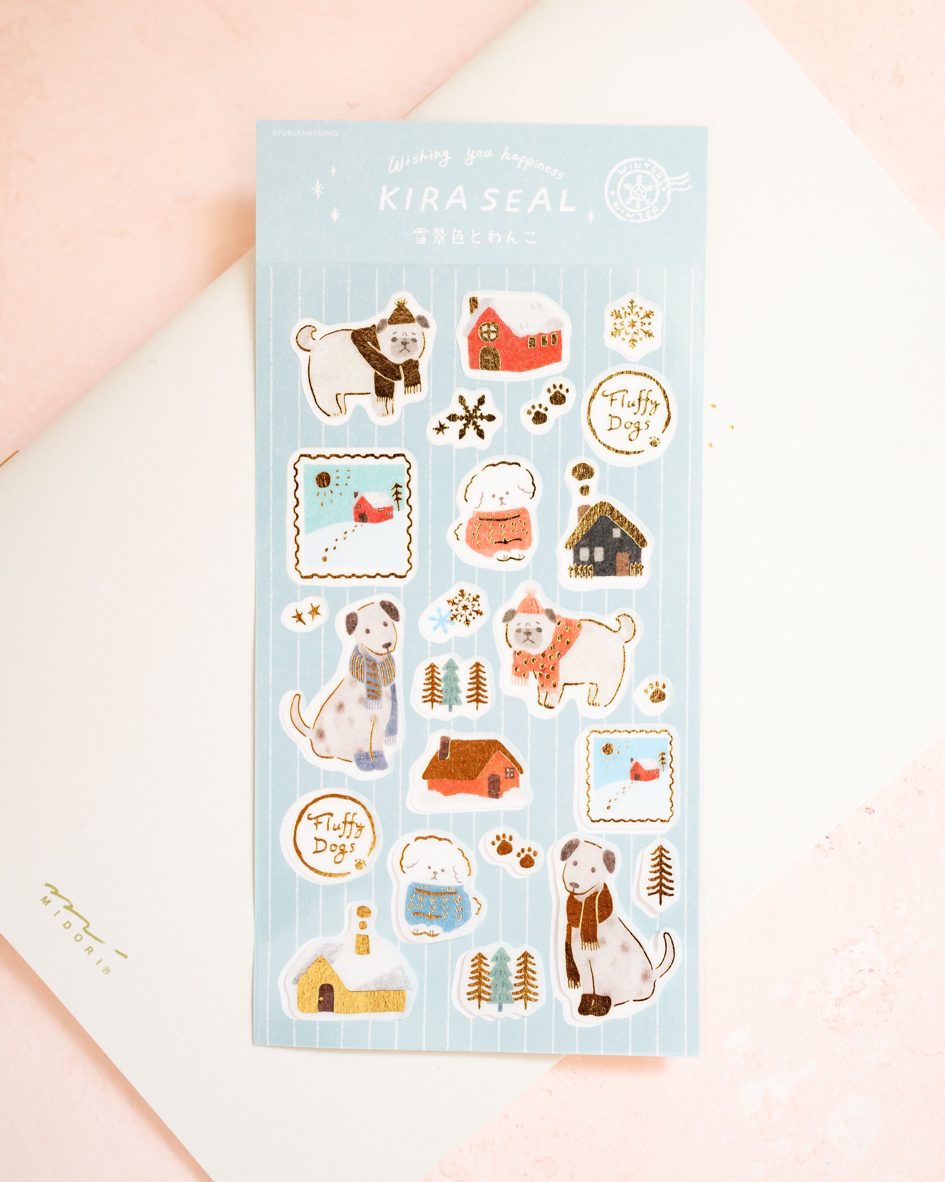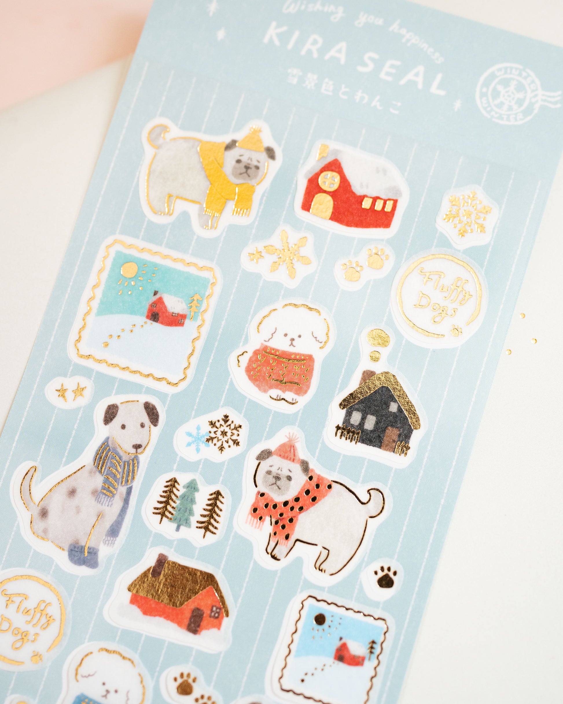 This sticker sheet is part of Furukawa Shiko Wa-Life's limited-edition Winter 2025 collection. It depicts a cheerful winter scene with small houses covered in snow and warmly dressed dogs—a heartwarming design that will appeal to all dog lovers. Each sticker is enhanced with gold accents, adding a delicate and festive touch.