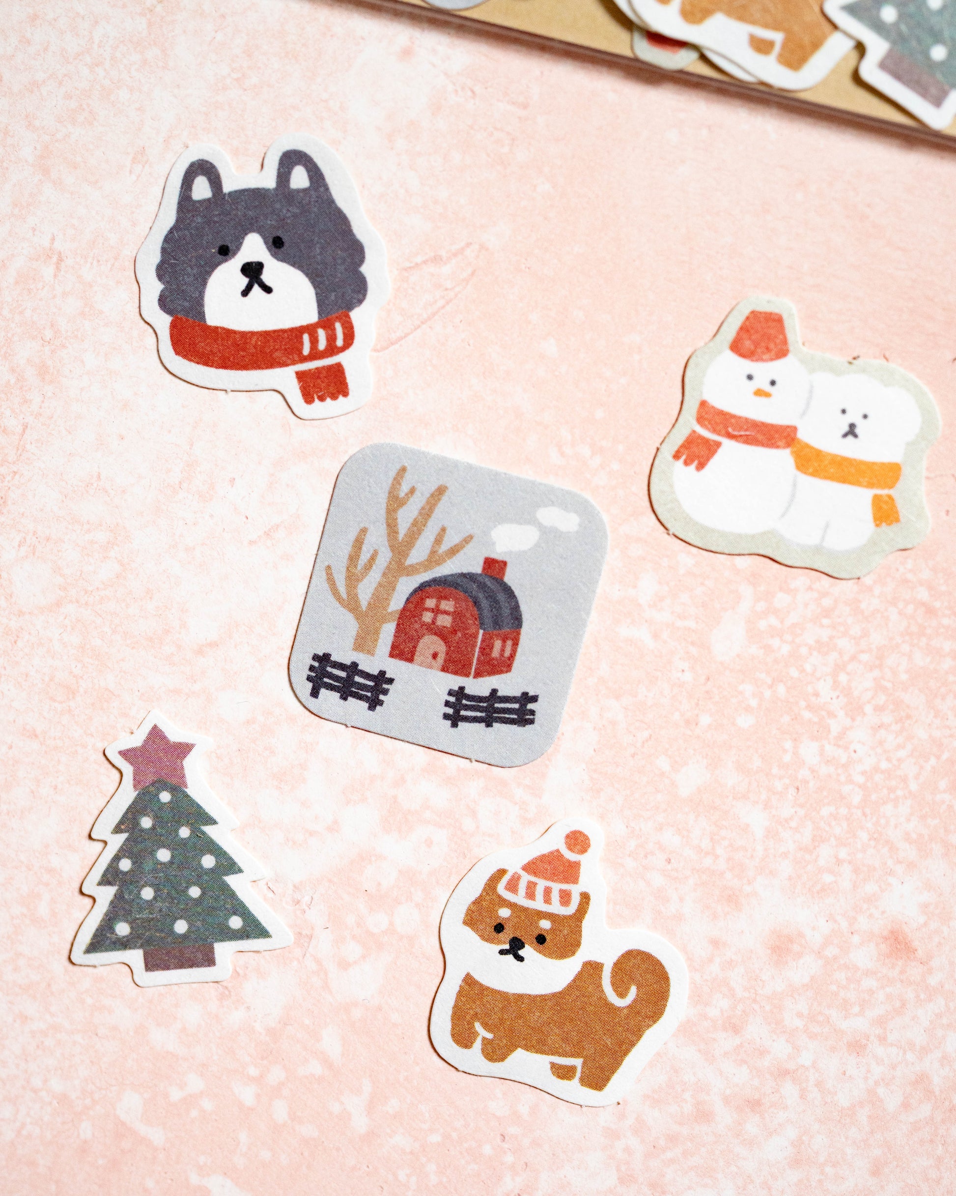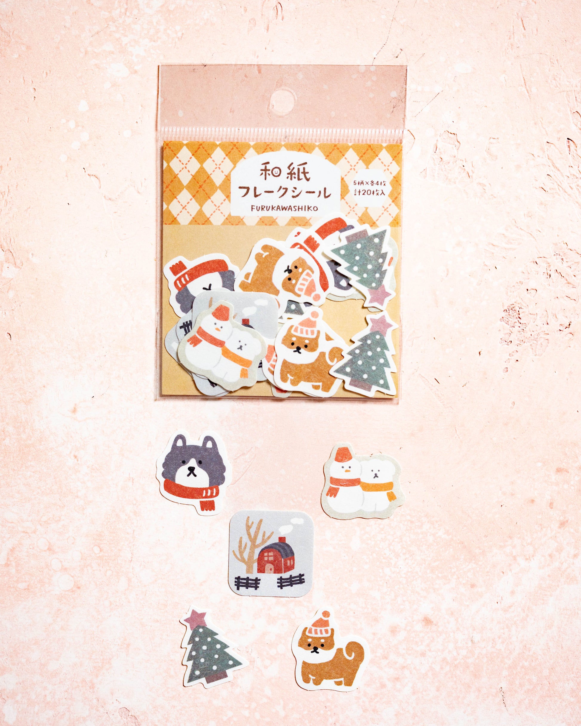 This set of washi flake stickers is part of Furukawa Shiko Wa-Life's limited-edition Winter 2025 collection. It depicts a cheerful winter scene with dogs, a design that will delight all dog lovers.