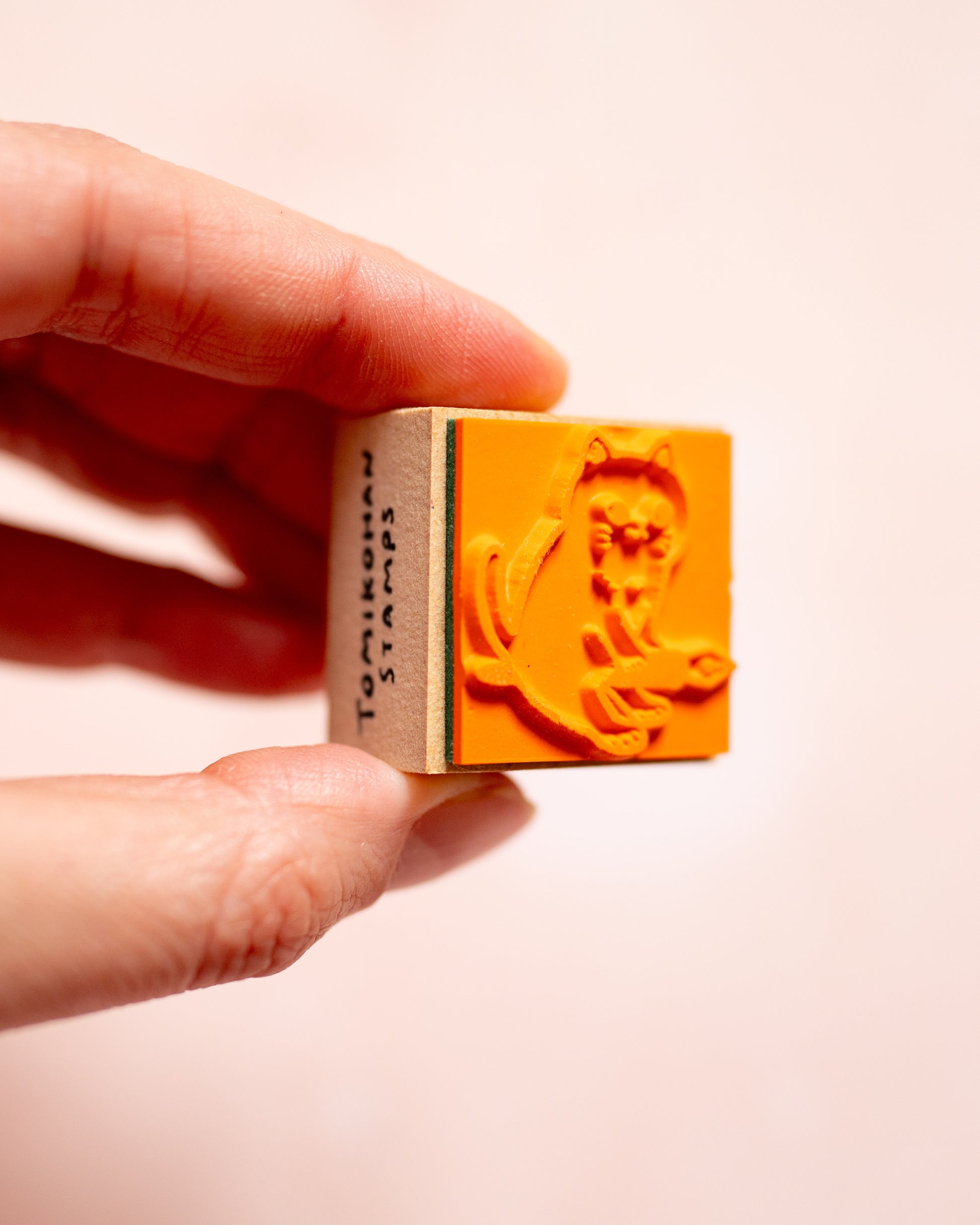 Un tampon plein de charme illustré par Tomiko Han représentant un adorable chat sur un stylo plume.