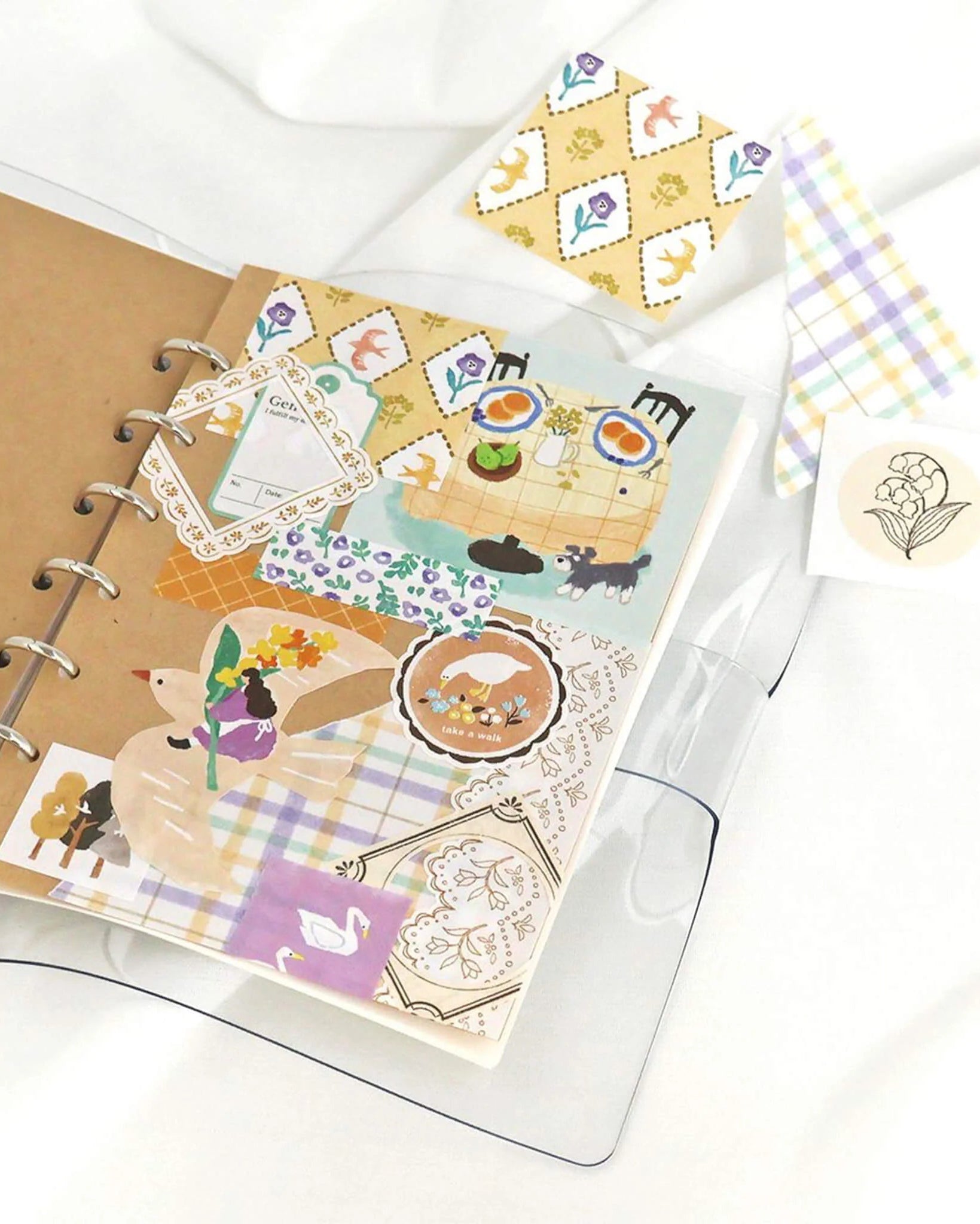 Les illustrations – filles, animaux, plantes, scènes de la vie quotidienne et gourmandises – racontent chacune une petite histoire et apportent une ambiance douce, chaleureuse et poétique à vos journaux, planners, cartes ou lettres.